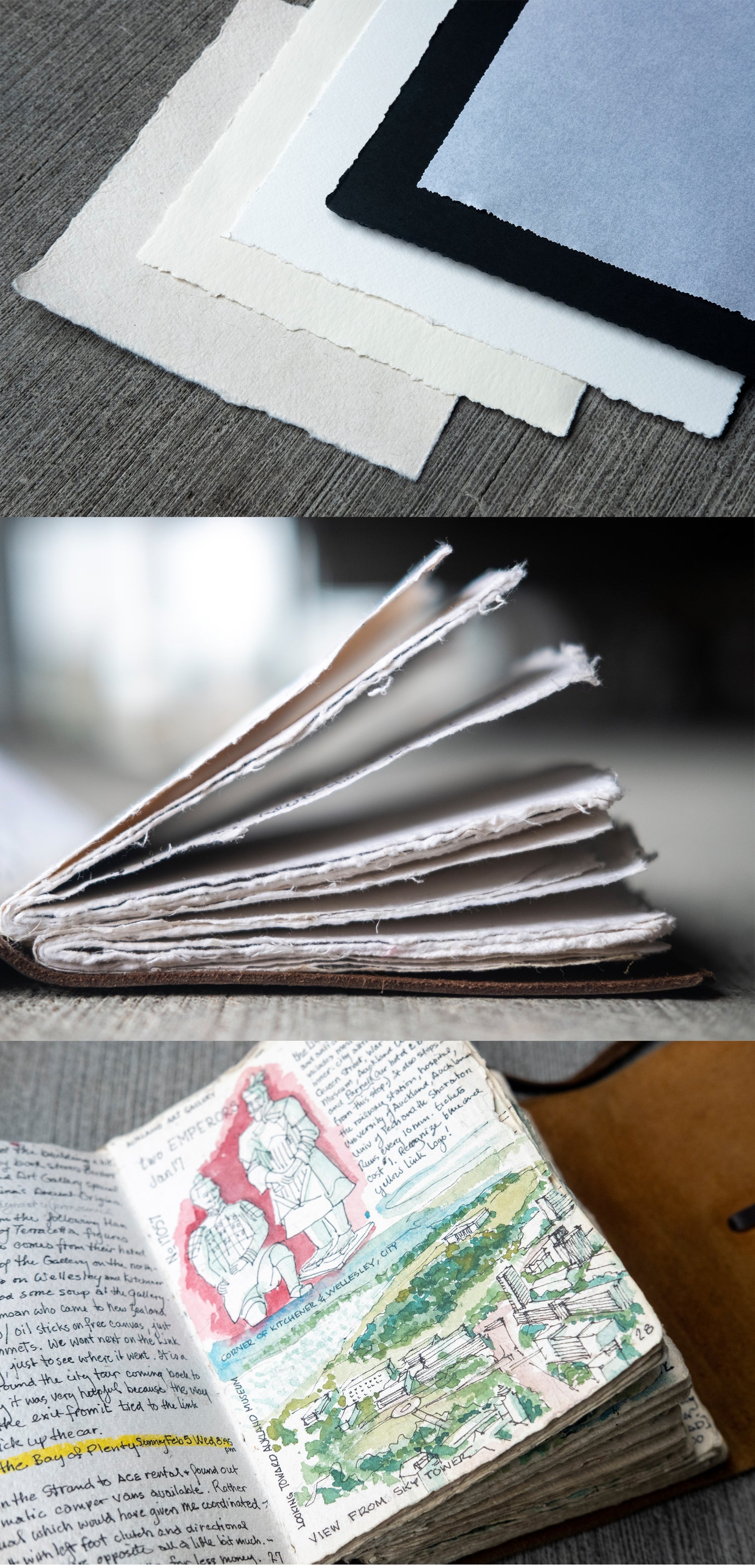 The three lighter colored papers are for the journals, and then there is the black paper and vellum on the right for photos. The first two papers on the left in the photo are handmade from recycled fabrics. And the 3rd paper from left is the bamboo paper, which is NOT handmade and therefore is a bit more consistent in texture. All three papers are excellent for writing with any medium nib pens, and will not allow bleed-through.