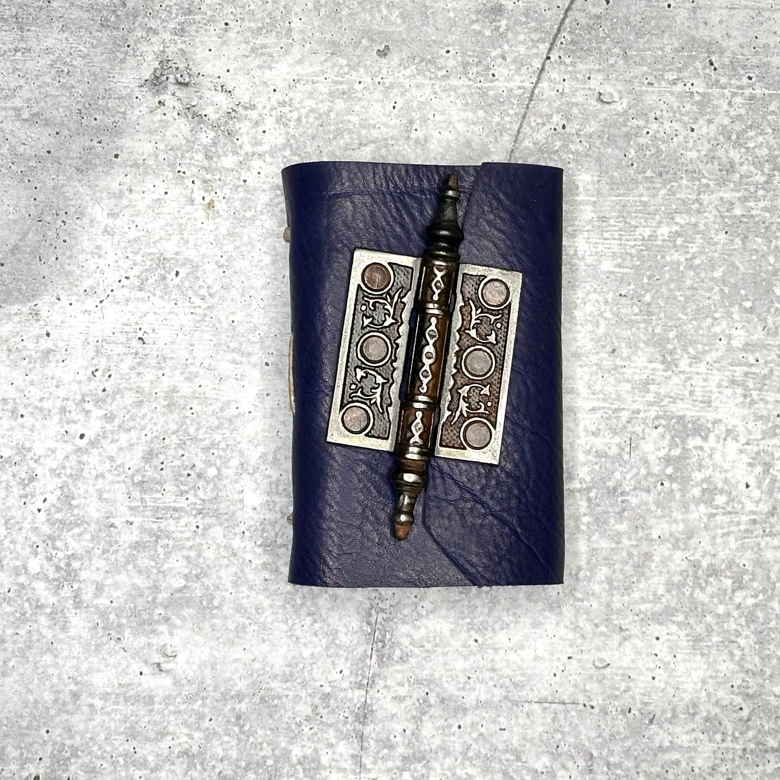 This book features an elegant Victorian era door hinge closure. To open, simply pull the pin out of the top of the hinge, and the top and bottom leather flaps can then pull away from one another. It is an authentic, repurposed antique hinge, dating back to the 1880’s-1890’s. It is attached with hand-hammered copper rivets.