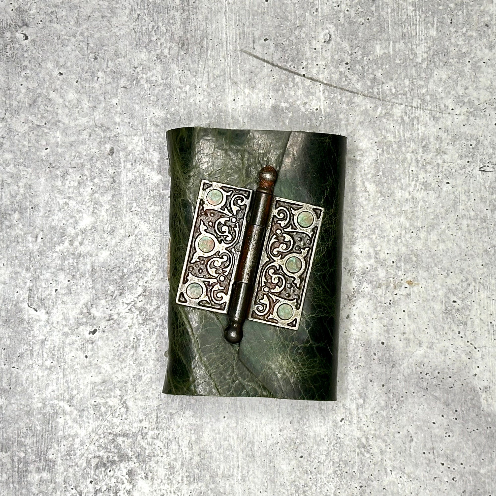 This book features an elegant Victorian era door hinge closure. To open, simply pull the pin out of the top of the hinge, and the top and bottom leather flaps can then pull away from one another. It is an authentic, repurposed antique hinge, dating back to the 1880’s-1890’s. It is attached with hand-hammered copper rivets.