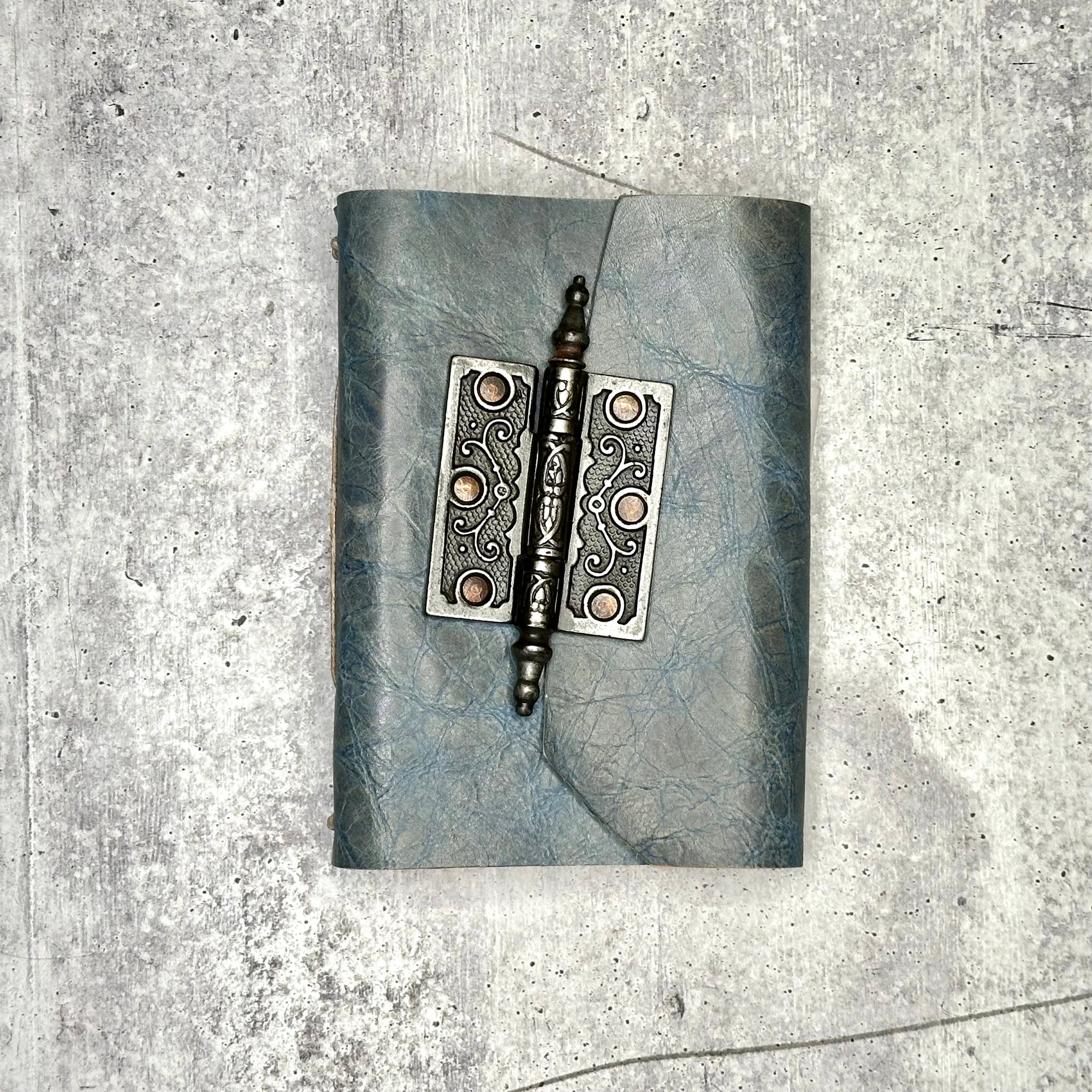 This book features an elegant Victorian era door hinge closure. To open, simply pull the pin out of the top of the hinge, and the top and bottom leather flaps can then pull away from one another. It is an authentic, repurposed antique hinge, dating back to the 1880’s-1890’s. It is attached with hand-hammered copper rivets.