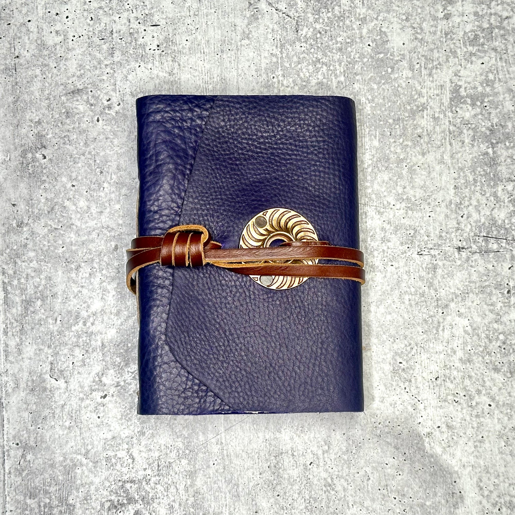 In addition to our traditional “monk’s wrap” leather strap, this book has a vintage rosette/back plate from an old doorknob on the front flap. This is an antique piece from the late 1800’s, and is attached with hand-hammered copper rivets.