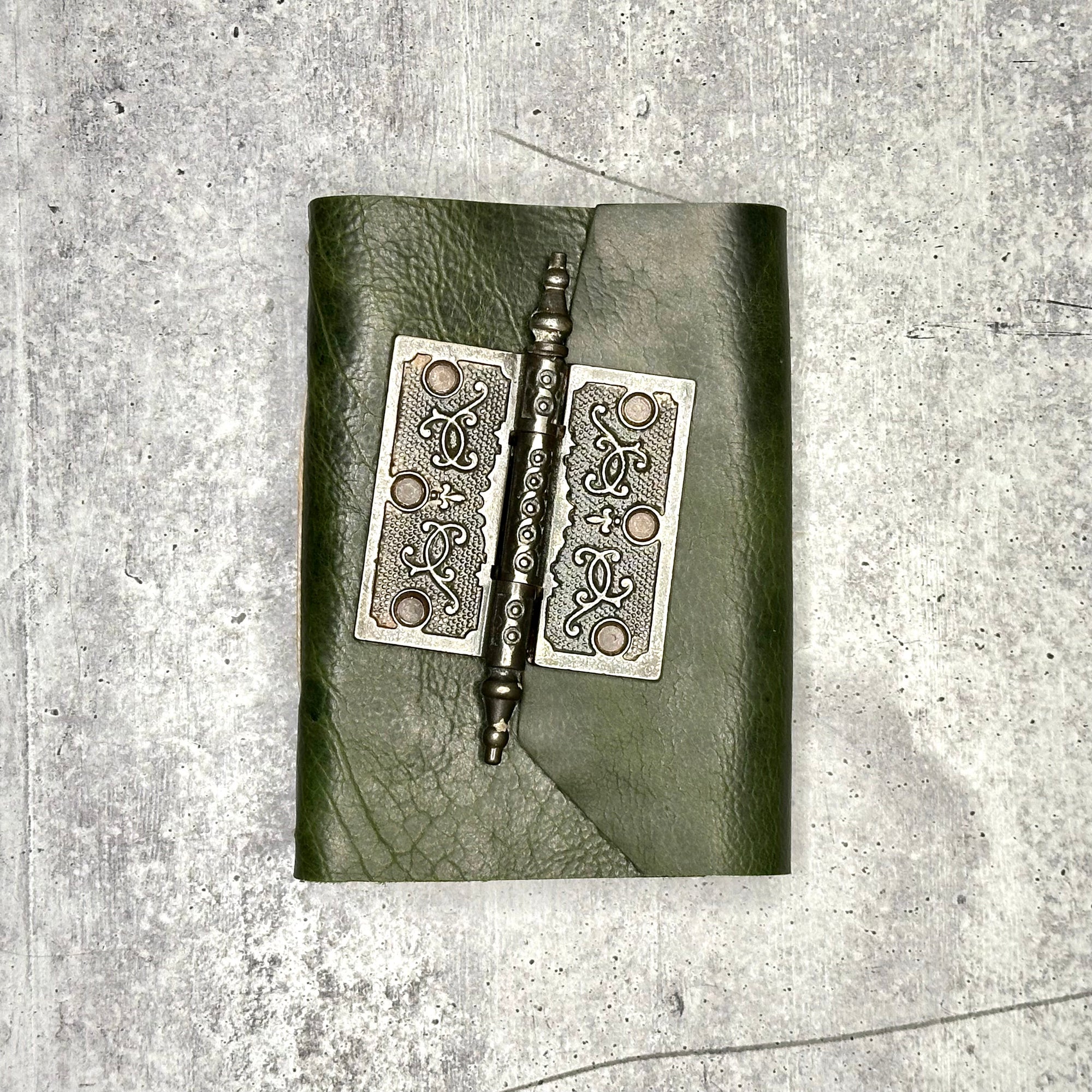 This book features an elegant Victorian era door hinge closure. To open, simply pull the pin out of the top of the hinge, and the top and bottom leather flaps can then pull away from one another. It is an authentic, repurposed antique hinge, dating back to the 1880’s-1890’s. It is attached with hand-hammered copper rivets.
