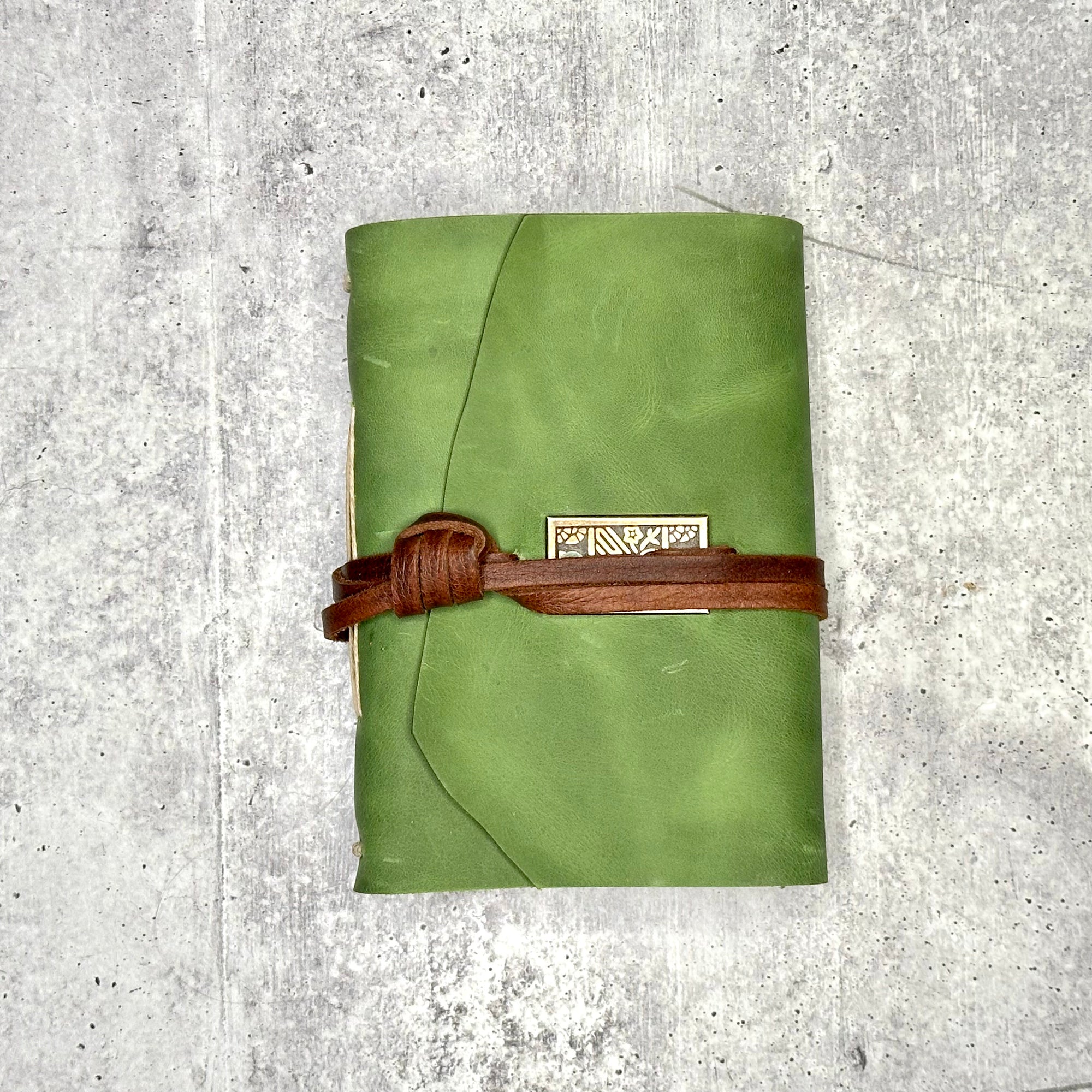 In addition to our traditional “monk’s wrap” leather strap, this book has a vintage keyhole cover on the front flap. This is an antique piece from the late 1800’s, and is attached with hand-hammered copper rivets.