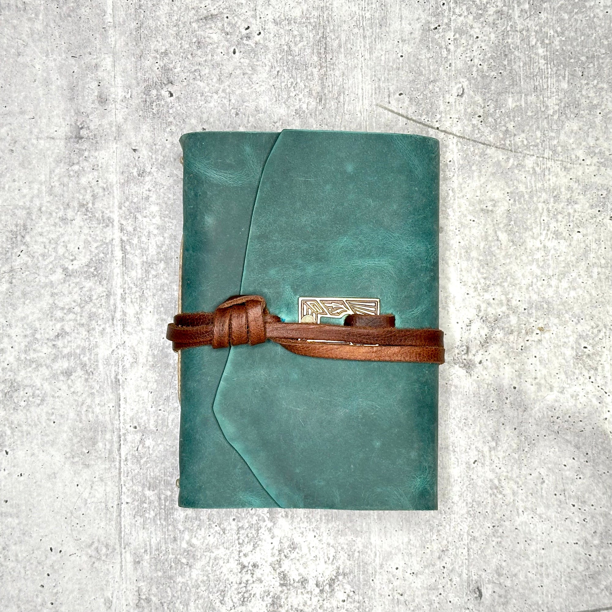 In addition to our traditional “monk’s wrap” leather strap, this book has a vintage keyhole cover on the front flap. This is an antique piece from the late 1800’s, and is attached with hand-hammered copper rivets.